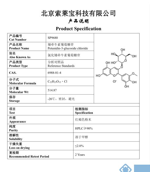 产品名称: 矮牵牛素-3-O-葡萄糖苷标准品